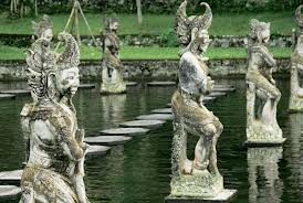The water palace at Tirtha Gangga, about 4 miles northwest of Amplapura, was built in 1948 by the last raja of Karangasem, A.A. Ngurah Ketut Karangasem, in a series of formal pools fed by a sacred spring. The eruption of Mount Agung in 1963, which buried much of the neighboring village of Subagan, badly damaged Tirtha Gangga. It has been gradually restored, and is open to the public for a small fee. A small hamlet of tourist accommodations and eating places has grown up here, but the main attraction is the swimming, several designated pools : a large one open to anyone, and a smaller one closer to the spring, for which an additional admission fee is charged. The water is indescribably refreshing, a swimming pool of holy water.